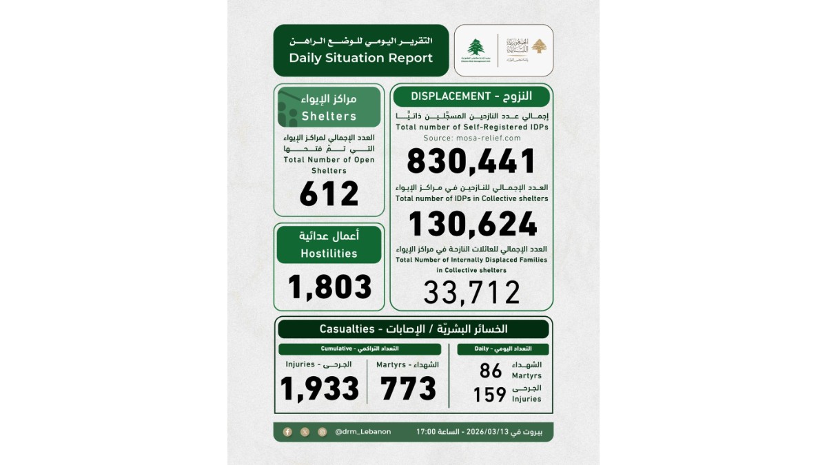 أعلنت وحدة إدارة مخاطر الكوارث في رئاسة مجلس الوزراء، في تقريرها اليومي، ويضمن أن إجمالي عدد النازحين المسجلين ذاتيا وصل إلى 830441 والعدد الإجمالي للنازحين في مراكز الإيواء بقلغ 130624″. وذكرت أن “حصيلة الشهداء ارتفعت إلى 773 والجرحى إلى1933”. ما هذه المعلومات والأرقام الواردة