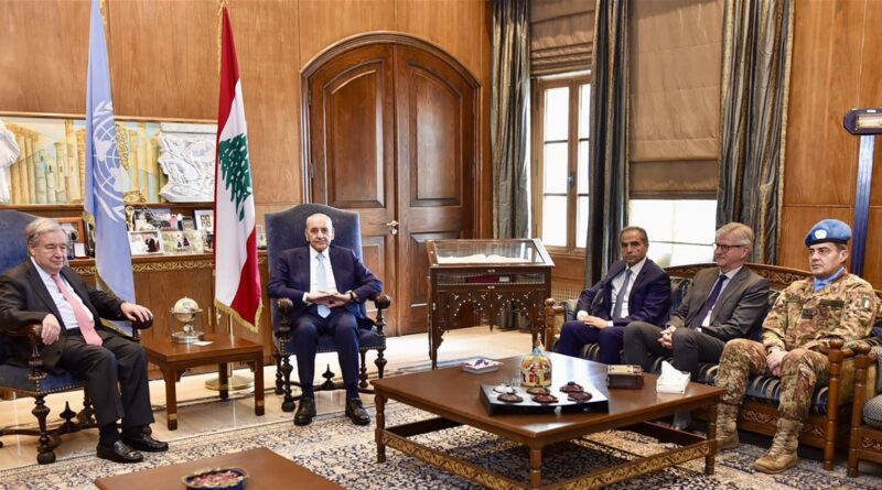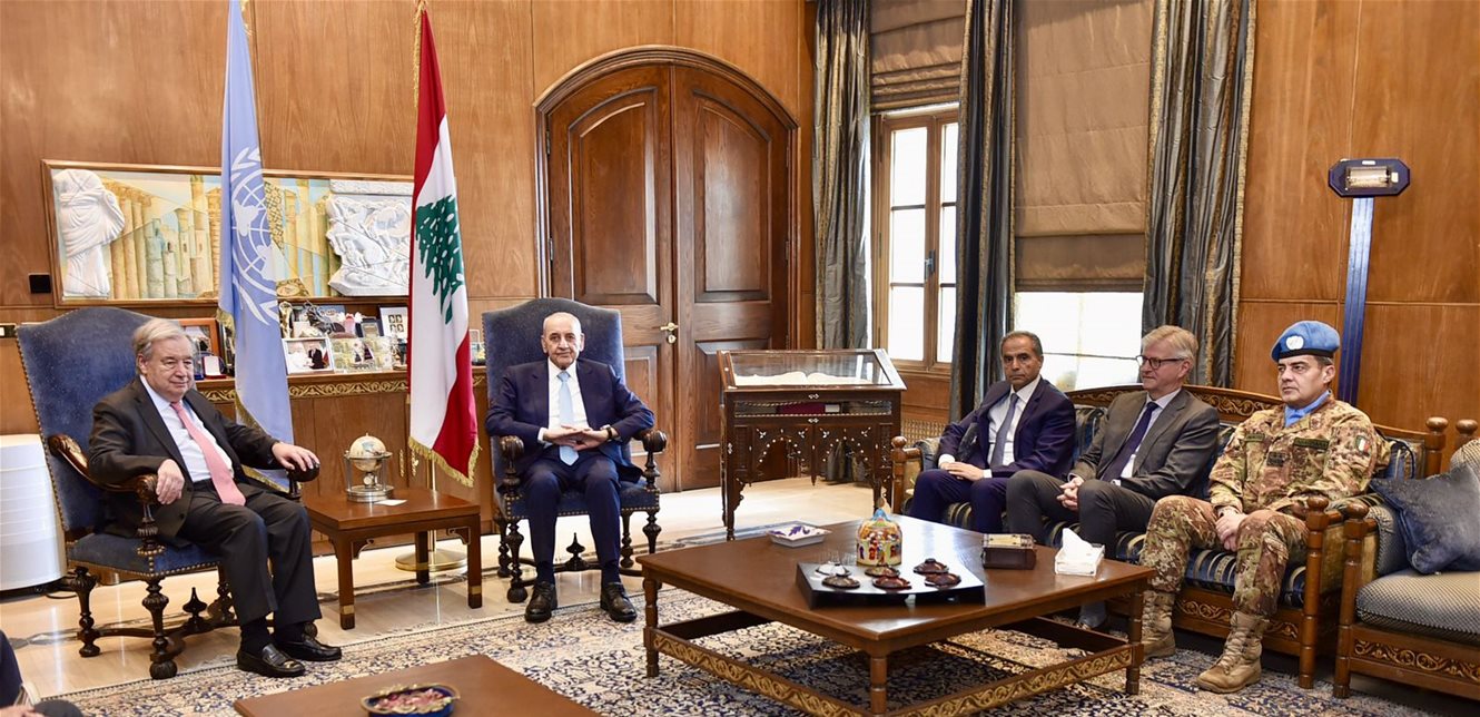 الرئيس بري جدد أمام غوتيرش التأكيد على “تمسك لبنان بالقرار الأممي 1701، والذي لا بديل عن قوات اليونيفيل لتطبيقه بمؤازرة الجيش اللبناني، داعياً إلى وجوب إلزام إسرائيل بوقف عدوانها وتطبيق إتفاق تشرين الثاني 2024 “.