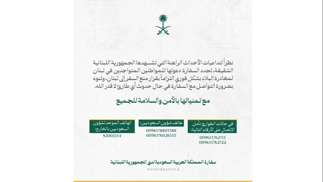 أعلنت سفارة المملكة العربية السعودية في بيان على حسابها على “إكس”، أنه “نظراً لتداعيات الأحداث الراهنة التي تشهدها الجمهورية اللبنانية الشقيقة، تجدد السفارة دعوتها للمواطنين المتواجدين في لبنان لمغادرة البلاد بشكل فوري، التزاماً بقرار منع السفر إلى لبنان، وتنوه بضرورة التواصل مع السفارة في حال حدوث أي طارئ لا قدر الله”.