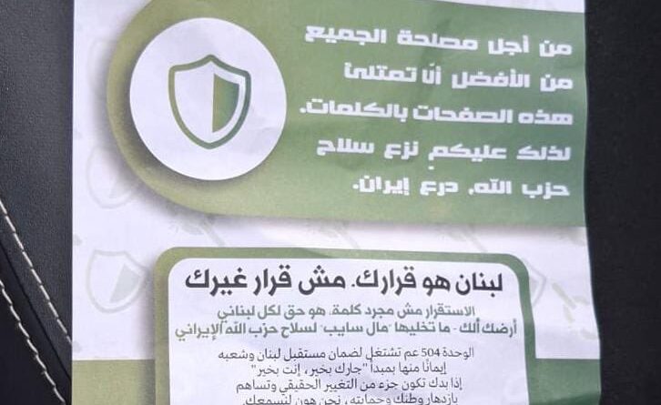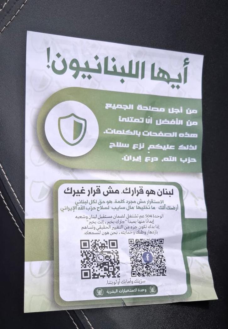 الق الطيرانن الإسرائيلي مناشير فوق بعض مناطق بيروت وخصوصا منطقتي الحمرا وقريطم، مما أثار الهلع بين المواطنين قبل أن يتأكدوا من سقوط مناشير كتب عليها ” أيها اللبنانيون من أجل مصلحة الجميع من الأفضل أن لا تمتلئ هذه الصفحات بالكلمات لذلك عليكم نزع سلاح حزب الله درع إيران، لبنان قراراك مش قرار غير الإستقرار مش مجرد كلمة هو حق لكل لبناني أرضك إلك ما تخليها مال سايب لسلاح حزب الله الإيراني”.