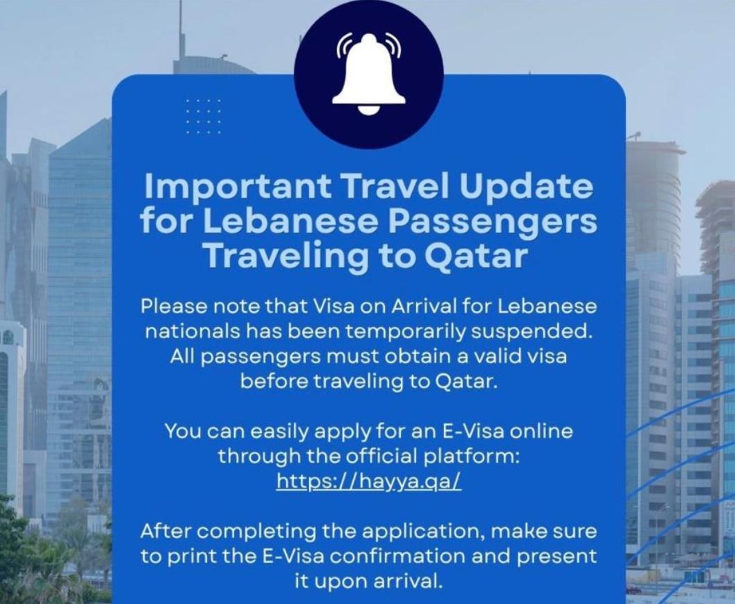 أعلنت السلطات القطرية تعليق نظام تأشيرة الدخول عند الوصول لمواطني الجمهورية اللبنانية، مؤكدة أنه يجب على كل مسافر لبناني الحصول على تأشيرة سارية مسبقًا قبل مغادرته.