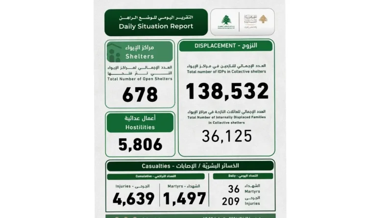 Read Moreنشرت وزارة الصحة العامة التقرير اليومي الصادر عن مركز عمليات طوارئ الصحة حول تطورات العدوان الإسرائيلي على لبنان، وجاء فيه