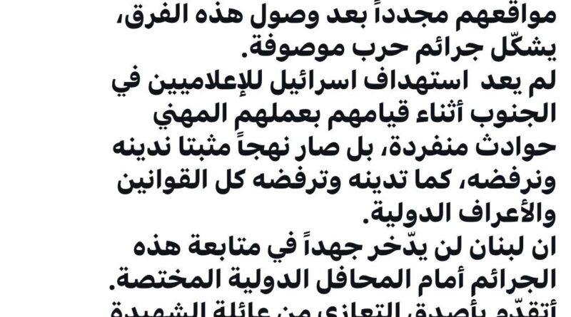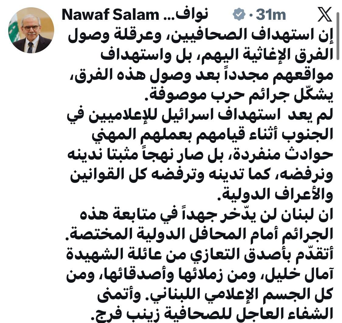 كتب رئيس الحكومة نواف سلام على منصة “إكس”: “إن استهداف الصحافيين، وعرقلة وصول الفرق الإغاثية اليهم، بل واستهداف مواقعهم مجدداً بعد وصول هذه الفرق، يشكّل جرائم حرب موصوفة. لم يعد استهداف اسرائيل للإعلاميين في الجنوب أثناء قيامهم بعملهم المهني حوادث منفردة، بل صار نهجاً مثبتا ندينه ونرفضه، كما تدينه وترفضه كل القوانين والأعراف الدولية. ان لبنان لن يدّخر جهداً في متابعة هذه الجرائم أمام المحافل الدولية المختصة. أتقدّم بأصدق التعازي من عائلة الشهيدة آمال خليل، ومن زملائها وأصدقائها، ومن كل الجسم الإعلامي اللبناني. وأتمنى الشفاء العاجل للصحافية زينب فرج”.