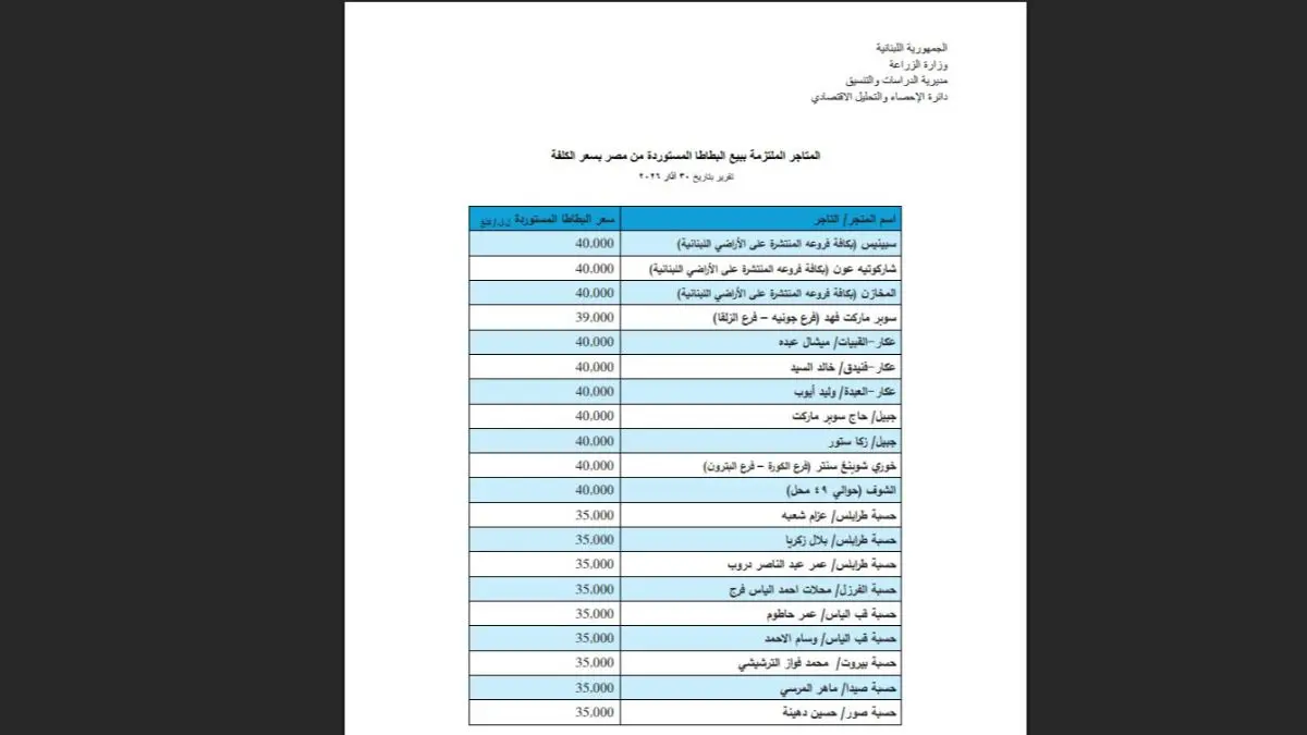 أعلنت وزارة الزراعة ونقابة مزارعي البطاطا في البقاع، لائحة المتاجر ونقاط البيع الملتزمة ببيع البطاطا بالسعر المخفض، في إطار المبادرة الهادفة إلى دعم الأمن الغذائي وتخفيف الأعباء المعيشية عن المواطنين.